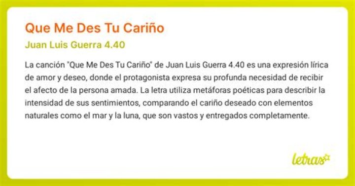 «Que Me Des Tu Cariño» de Juan Luis Guerra es una canción romántica que expresa un profundo anhelo y deseo de amor y cariño. Las letras de esta emotiva canción transmiten el efecto embriagador que el amor de una persona tiene en el cantante, describiéndolo como una cura para su locura y una unción para sus labios. Esta canción resalta la importancia del amor en la vida de una persona y cómo puede hacer que todo sea significativo y completo.