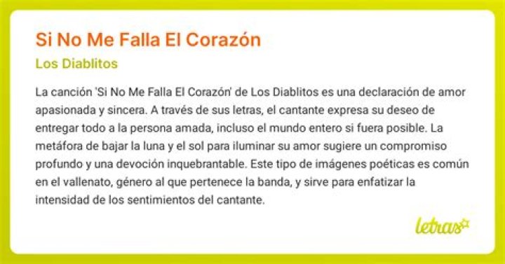 En resumen, «Si No Me Falla El Corazón» de Los Diablitos es una joya musical que nos habla sobre el amor inquebrantable, la perseverancia y el deseo de una conexión profunda y eterna con la persona que apreciamos. A través de sus letras, esta canción nos invita a reflexionar sobre el verdadero significado del compromiso amoroso y nos inspira a amar con pasión y dedicación. Es una canción que ha dejado una marca imborrable en mi corazón y que siempre recordaré como una expresión pura de amor verdadero.