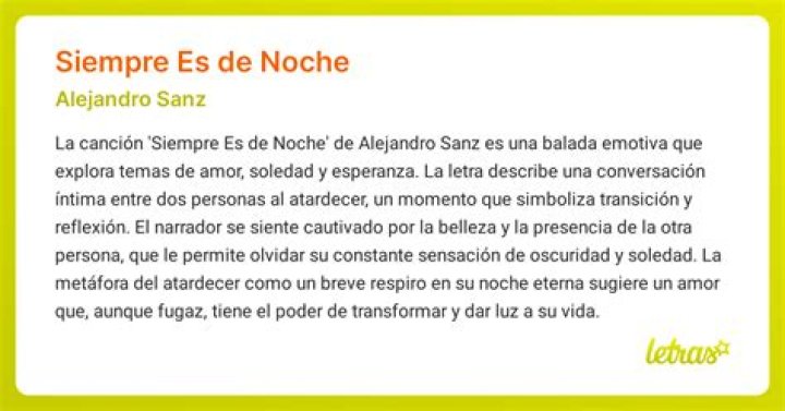 «Siempre es de noche» de Alejandro Sanz es una canción conmovedora e introspectiva que explora sentimientos de anhelo, oscuridad y el poder transformador del amor. A través de letras evocadoras y poéticas, Sanz se sumerge en las profundidades de sus emociones y experiencias de vida, resaltando el anhelo humano universal por la conexión y el deseo de escapar de las sombras que afligen nuestra existencia.