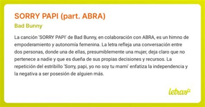 «SORRY PAPI» es una colaboración entre Bad Bunny y ABRA que explora temas de empoderamiento, independencia y deseo sexual. El contenido lírico de la canción revela la dinámica entre dos individuos, donde la protagonista femenina afirma su autonomía y se niega a conformarse a las expectativas sociales.