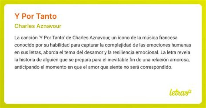 Yo he tenido el privilegio de experimentar la magnífica melodía y las poderosas letras de la canción «Y por tanto» de Charles Aznavour. Esta canción transforma el dolor y las heridas de una relación fallida en una obra maestra musical que resuena con cada fibra de mi ser. A través de las palabras cuidadosamente seleccionadas y la emotiva interpretación de Aznavour, esta canción captura la esencia misma del amor no correspondido y la lucha interna para dejar ir.
