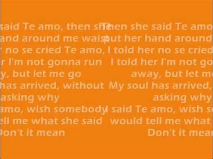 Then she said, Te amo then she put her hand around me waist I told her no, she cried Te amo I told her I not gonna run away But let me go... My soul hears her cry, without asking why I said Te amo Wish somebody tell me what she say Don’t it mean I love you I think it means I love you Don’t it mean I love you (Verse) Te amo, Te amo she's ...