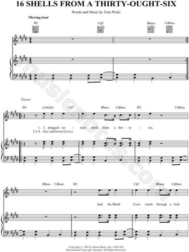 Musically, “16 Shells from a Thirty-Ought-Six” showcases the distinct and unconventional style for which Tom Waits is renowned. The unconventional instrumentation, featuring unique percussion, brass instruments, and Waits’ distinctive gravelly voice, contributes to the raw and gritty atmosphere of the song. The use of dissonance and unconventional chord progressions further adds to its haunting and mysterious quality.