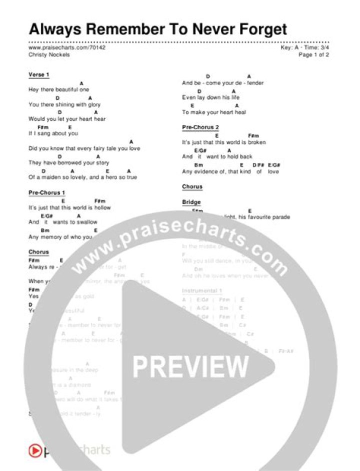 In conclusion, “Always Remember to Never Forget” by Christy Nockels is a song that carries a powerful message of self-worth and beauty. Through its lyrics, Nockels encourages us to hold onto our true identity and not succumb to the world’s standards. This song serves as a reminder that we are loved and cherished just as we are, and that our stories are significant. Let this song be an anthem that reminds us to always remember and never forget our worth, no matter what the world may say.