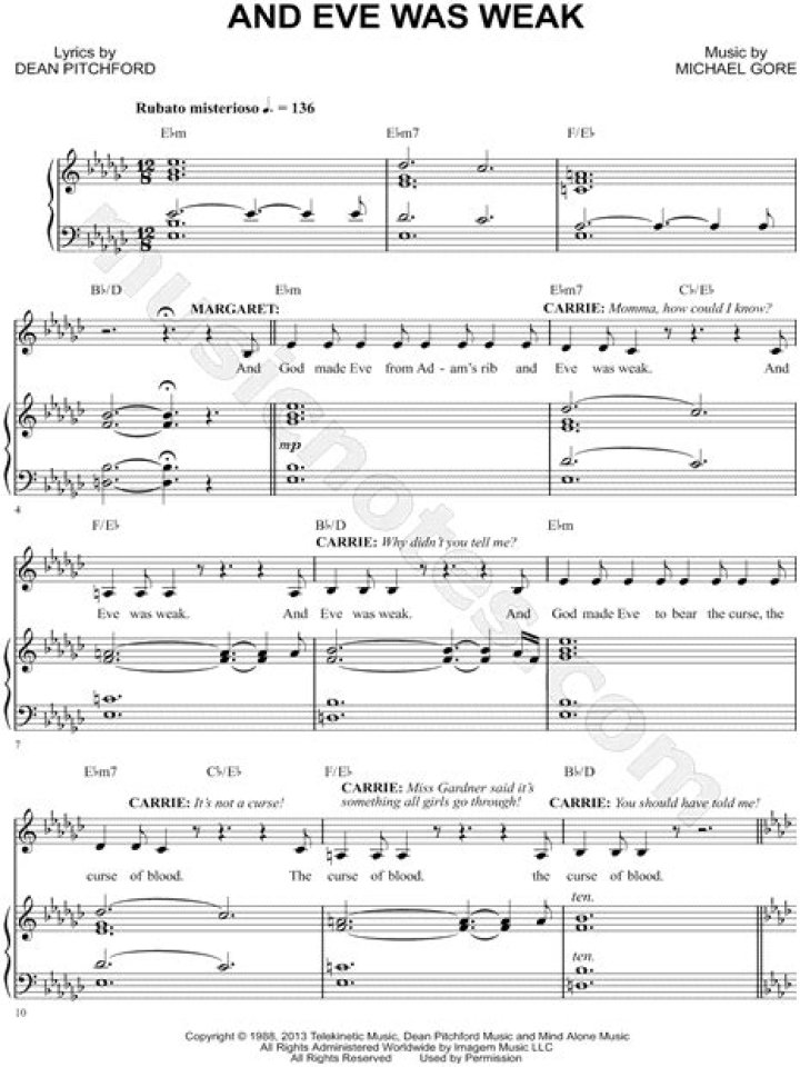 In the musical adaptation of Stephen King’s iconic novel Carrie, the song “And Eve Was Weak” serves as a pivotal moment in the storyline. It is performed by the character Margaret, Carrie’s deeply religious and overprotective mother, who reacts with fear and panic upon learning that her daughter has reached womanhood. The lyrics of this haunting song delve into themes of sin, shame, and the burden of femininity.