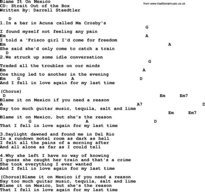 As a true lover of music, I am always on the search for songs that have a deep meaning and resonate with my soul. One such song that has always held a special place in my heart is “Blame It on Mexico” by the legendary George Strait. From the moment I first heard it, I was captivated by its beautiful melodies and heartfelt lyrics. In this article, I would like to delve into the meaning behind this timeless piece of artistry.