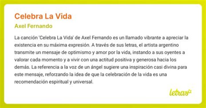 In conclusion, “Celebra La Vida” by Axel Fernando holds a special place in my heart. Its lyrics and melodies have the power to uplift and inspire, serving as a constant reminder to celebrate life’s joys and persevere through challenges. This song carries a meaningful message that transcends language barriers and speaks to the universal human experience. May we all embrace the spirit of “Celebra La Vida” and find joy in the journey we call life.