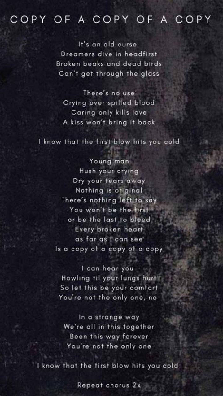 The repetition of the phrase “copy of a copy of a copy” throughout the song emphasizes the loss of originality and the fear of becoming one among many, merely replicating what has already been done. This repetition serves as a powerful reminder of the importance of maintaining one’s unique voice and identity.