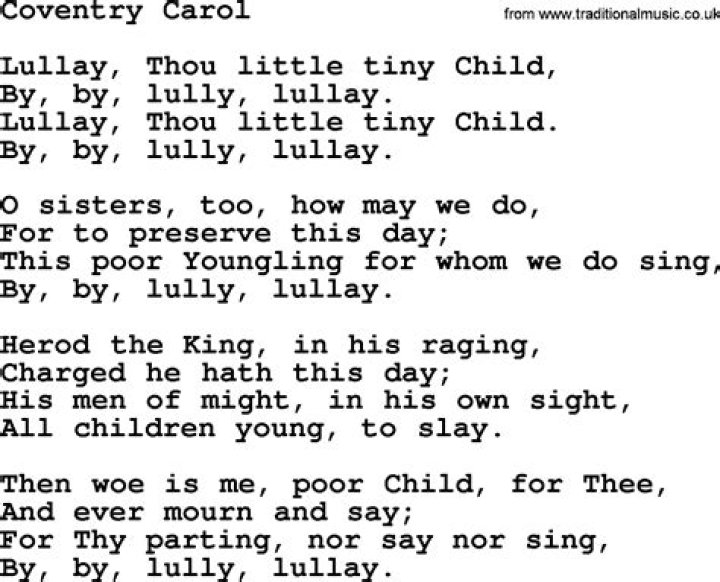 The Coventry Carol is believed to have originated in England during the 16th century and was written for the “Coventry Mystery Play,” a series of theatrical performances that depicted biblical stories. The song serves as a lullaby sung by a mother or a group of mothers to their children, as they lament the imminent threat of King Herod’s decree to kill all male infants in Bethlehem in an attempt to eliminate the newborn Jesus.