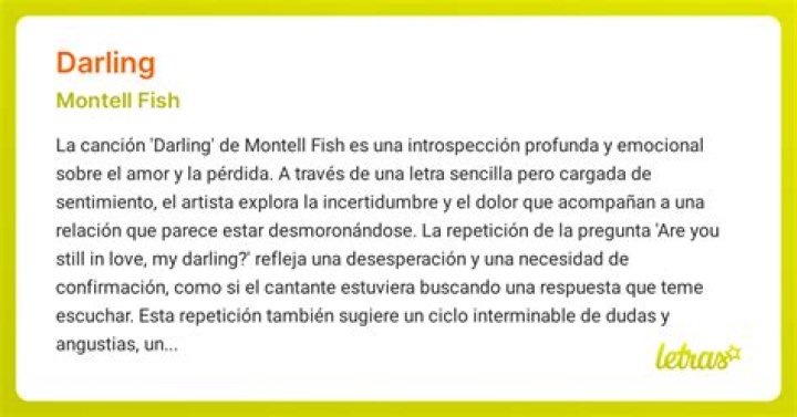 In conclusion, Montell Fish’s song “Darling” delves into the complex emotions that come with a lost love and the struggle to let go. Its lyrics and melodic composition create a space for listeners to reflect on their own experiences of heartbreak and find solace in the shared understanding of human emotions. “Darling” is a beautiful reminder that healing and growth can be found even in the midst of pain.