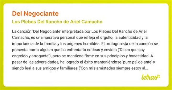 DEL Negociante is a popular song by Ariel Camacho y Los Plebes Del Rancho, a renowned Mexican regional band. The song holds a deep meaning and connects with listeners on multiple levels. It tells the story of the daily life and struggles of a businessperson, showcasing the realities and complexities of this profession. Through powerful lyrics and a captivating melody, DEL Negociante resonates with a wide audience and has become a favorite among fans of regional Mexican music.