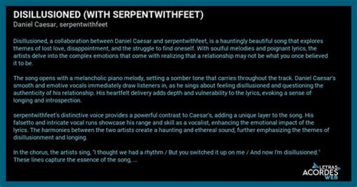 As a music critic, I have come across countless songs that have touched my heart and resonated with me on a deep level. However, there are few songs that have left such a lasting impression on me as “Disillusioned” by Daniel Caesar and serpentwithfeet. From the moment I first heard this song, I was captivated by its raw emotion and thought-provoking lyrics.