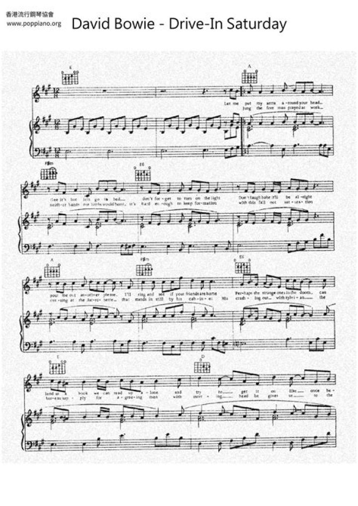The music in Drive-In Saturday features a slow intro with a modulating arrangement that builds up to a warm chorus. The bass riff drives you through the song, underpinned by a crepuscular saxophone playing. The melody is accompanied by a series of background vocals. The song features a variety of instruments including drums, saxophone, bass guitar, guitar and piano. Overall, the instrumentation of the song complements well to paint the picture of the scene that Bowie was attempting to create.