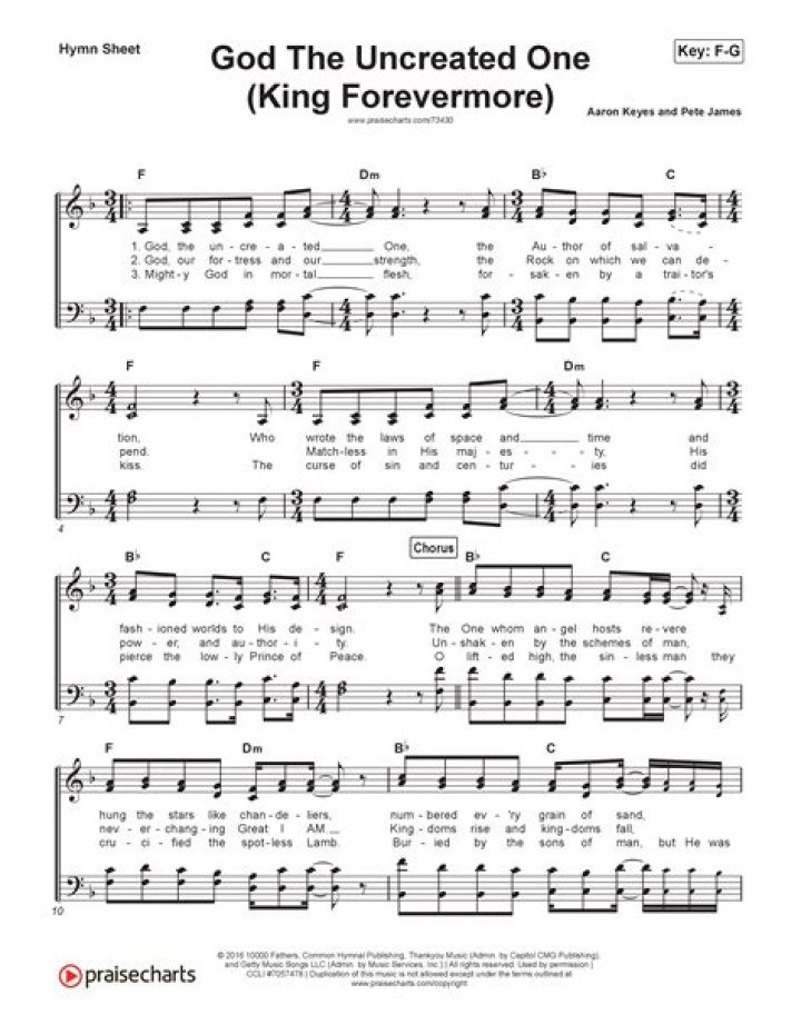 In conclusion, “God the Uncreated One (King Forevermore)” by Keith & Kristyn Getty is a worship song that celebrates the eternal sovereignty and unmatched power of God. Through its powerful lyrics and captivating melody, it invites listeners to crown Jesus as the King forevermore. This song has touched the hearts of many, including myself, reminding us of God’s everlasting reign and inspiring us to worship Him with awe and reverence.
