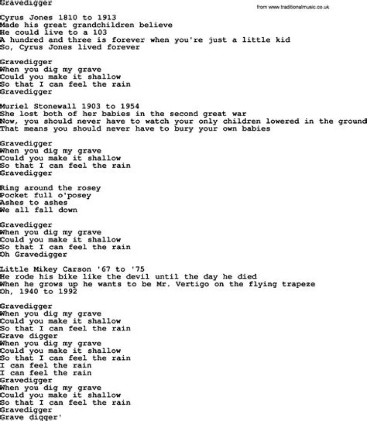 Throughout “Gravedigger”, the recurring chorus plays a crucial role in conveying the underlying theme of mortality. The request for a shallow grave, “so that I can feel the rain”, highlights the desire to remain connected to the world even after death. It symbolizes the yearning for a continued existence, even if it’s just experiencing the raindrops touching the surface of one’s final resting place.