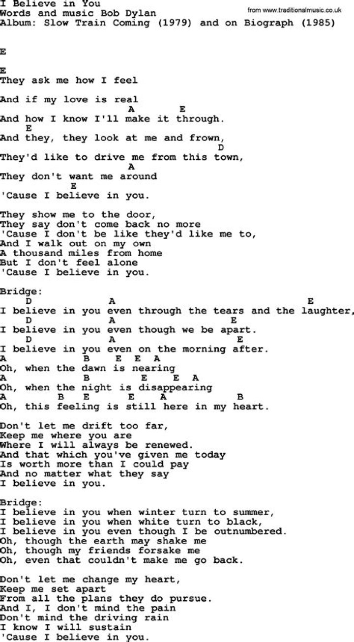 The lyrics in “I Believe in You” hold great significance as they delve into the depths of human emotions and the power of faith. They serve as an affirmation of Dylan’s personal relationship with God and his unshakeable trust in divine guidance.