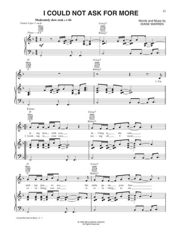 The lyrics of “I Could Not Ask for More” convey a profound sense of appreciation and contentment in a relationship. It speaks to the idea that finding someone who loves you unconditionally and accepts you for who you are is a true blessing. The song paintS a vivid picture of a love that refreshes one’s spirit and brings joy and fulfillment to life. It exemplifies the belief that true happiness lies in cherishing and embracing the moments shared with a loved one.