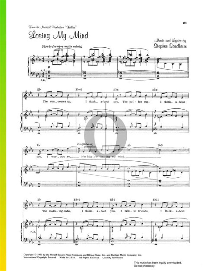 The song “Losing My Mind” by Stephen Sondheim is a captivating and emotionally-charged piece that explores the complex themes of love and obsession. Specifically written for the musical “Follies,” the song delves into the tumultuous state of mind experienced by a character named Sally Durant Plummer. As the lyrics unravel, we witness Sally’s intense yearning for a love that is both unattainable and emotionally crippling. The vulnerability portrayed in the song allows listeners to connect with the universal theme of unrequited love and the profound effect it can have on one’s psyche.