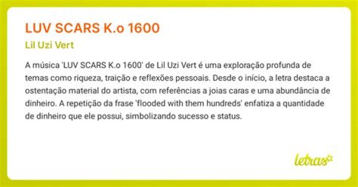 LUV SCARS K.o 1600, a song by Lil Uzi Vert, delves into the artist’s personal experiences and emotions, as he reflects on his journey of growing up in the streets of Philadelphia while navigating his newfound success as a rapper. The song explores themes of loyalty, betrayal, and the loss of close friends, all set against the backdrop of Lil Uzi Vert’s rise to fame.