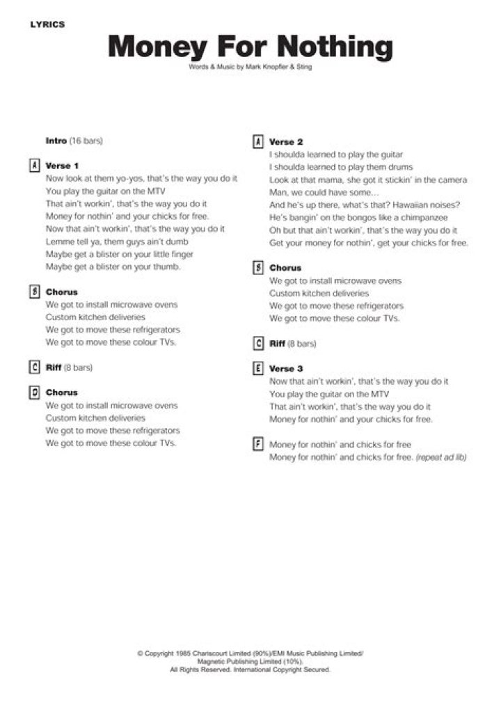 The lyrics of “Money for Nothing” are written from the perspective of a fictional character, a blue-collar worker reflecting on his frustration and resentment towards the glamorous lifestyle of rock stars on MTV. The song criticizes the shallow and materialistic nature of fame and success, highlighting the notion that some individuals seemingly achieve wealth and popularity with minimal effort. The title itself, “Money for Nothing,” represents the resentment felt by the protagonist, who believes that these rock stars effortlessly earn vast amounts of money while he struggles with his own work.