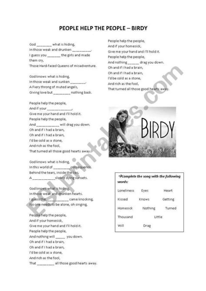 The chorus serves as an uplifting call to action, urging individuals to lend a helping hand to one another in times of need. “People help the people” becomes a mantra of hope and solidarity, reminding us that we are not alone in our struggles. The line “And if you’re homesick, give me your hand and I’ll hold it” evokes a sense of compassion and support, reminding us of the power of human connection and empathy.