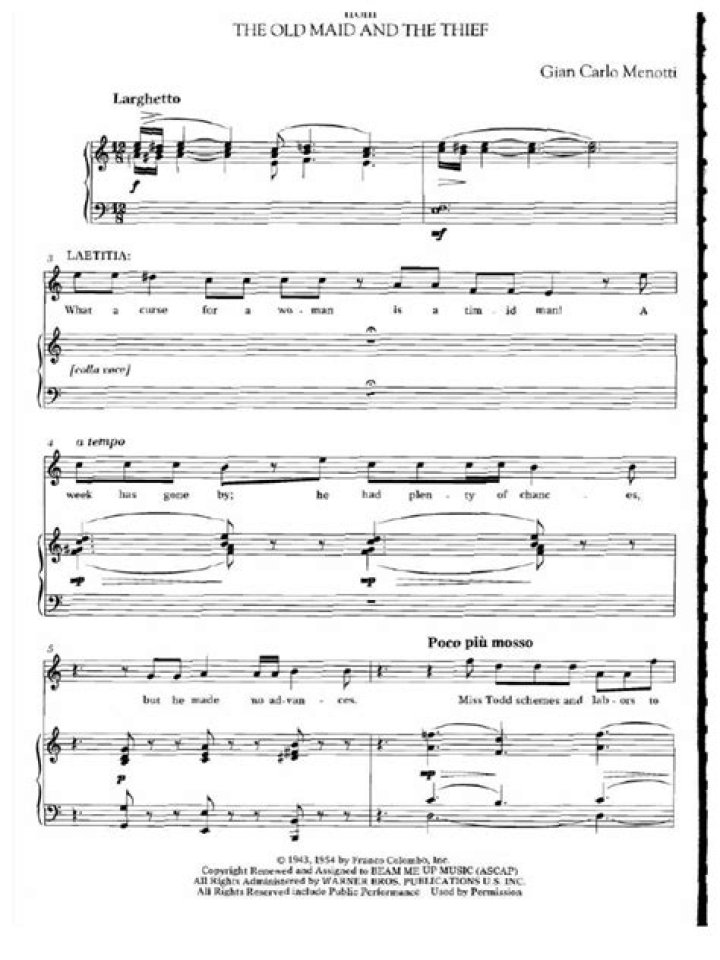 “Steal Me, Sweet Thief” is a part of Menotti’s radio opera, “The Old Maid and The Thief.” The opera tells the story of Miss Todd, an elderly woman who takes in a mysterious wanderer named Bob. Miss Todd and her maid, Laetitia, become increasingly fond of Bob’s presence in their household, even though the town is abuzz with news of an escaped convict who bears a striking resemblance to him.