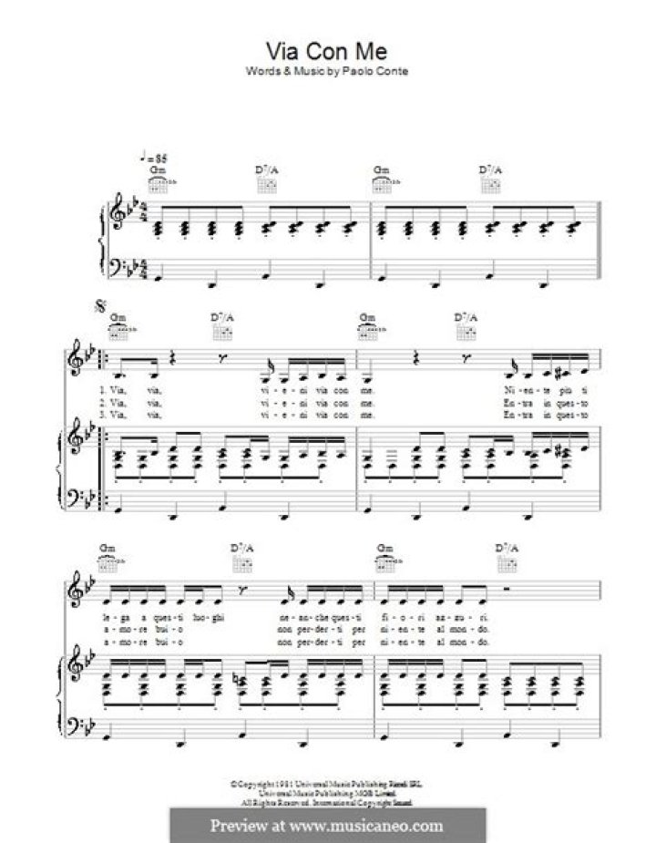 Via con me is a mesmerizing song composed and performed by the talented Italian singer-songwriter Paolo Conte. Released in 1981, this iconic track has captivated audiences worldwide with its enchanting melody and poetic lyrics. When translated into English, “Via con me” means “Go with me,” and the song speaks to themes of love, freedom, and the pursuit of happiness. Paolo Conte’s unique blend of jazz, pop, and cabaret elements creates a timeless masterpiece that continues to resonate with listeners to this day.