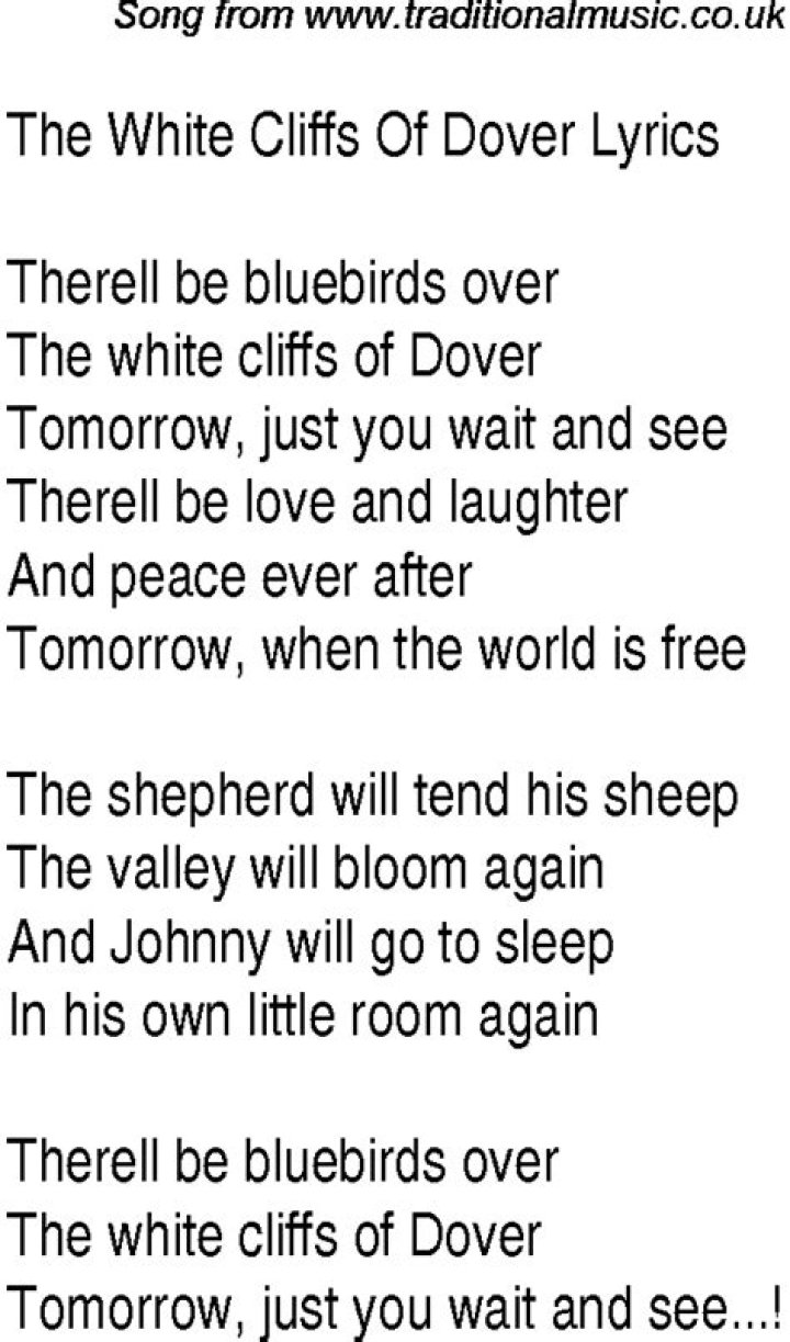 Get lyrics of The white cliffs of dover song you love. List contains The white cliffs of dover song lyrics of older one songs and hot new releases. Get known every word of your favorite song or start your own karaoke party tonight :-).