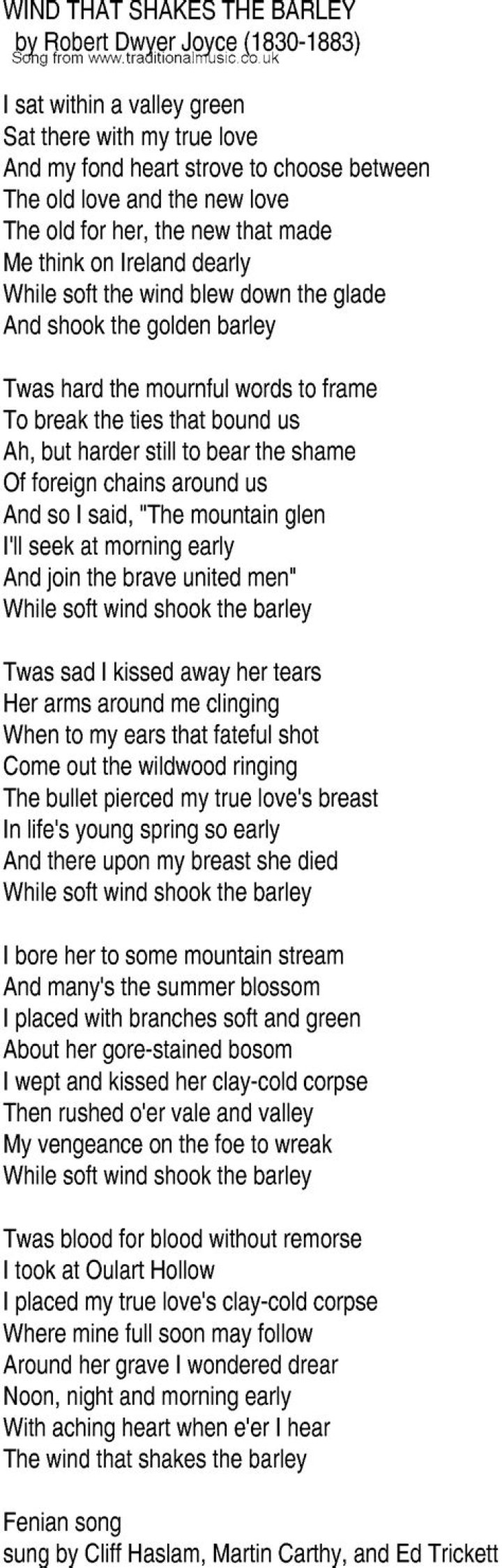 That rides upon the wind that shakes the barley Then Bridget, she declared That she was not prepared To watch us dance to the tune of Elsie Marley She said I'll sing you all a song And you'll want to sing along If you listen to the wind that shakes the barley And the song that she sang Could be heard for miles around The air was full of harmonyDick Gaughan - The Wind That Shakes the Barley Lyrics ...