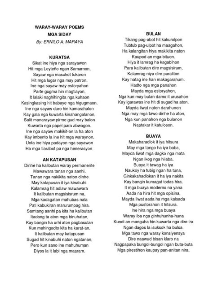 Waray Waray manigas! Waray Waray tawag sa akun, sa bakbakan, diri magurong sa sinuman ang humahamon kahit ikaw, ay maton! Likas sa ating paraluman kami'y palagi, mapagbigay Ngunit iba ang waray waray walang sindak kaninuman Kaming babaeng waray waray ay siga siga, kahit saan Ngunit iba ang waray waray Kapag hinamon ng away.Nursery Rhymes Song Lyrics