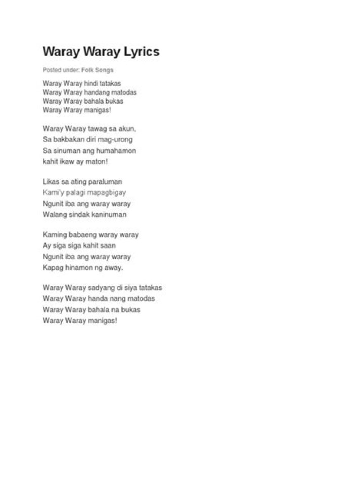 Search for lyrics and artists in our massive database of song lyrics! Lyrics. Popular Song Lyrics. Billboard Hot 100. Upcoming Lyrics. Recently Added. ... by Sylvia La Torre on album Waray Waray. WARAY-WARAY, HINDI TATAKAS… WARAY-WARAY, HANDANG MATODAS… WARAY-WARAY, BAHALA BUKAS… WARAY-WARAY, MANIGAS!!!LEA SALONGA - ISANG IINHHONG PAG-IBIG LYRICS