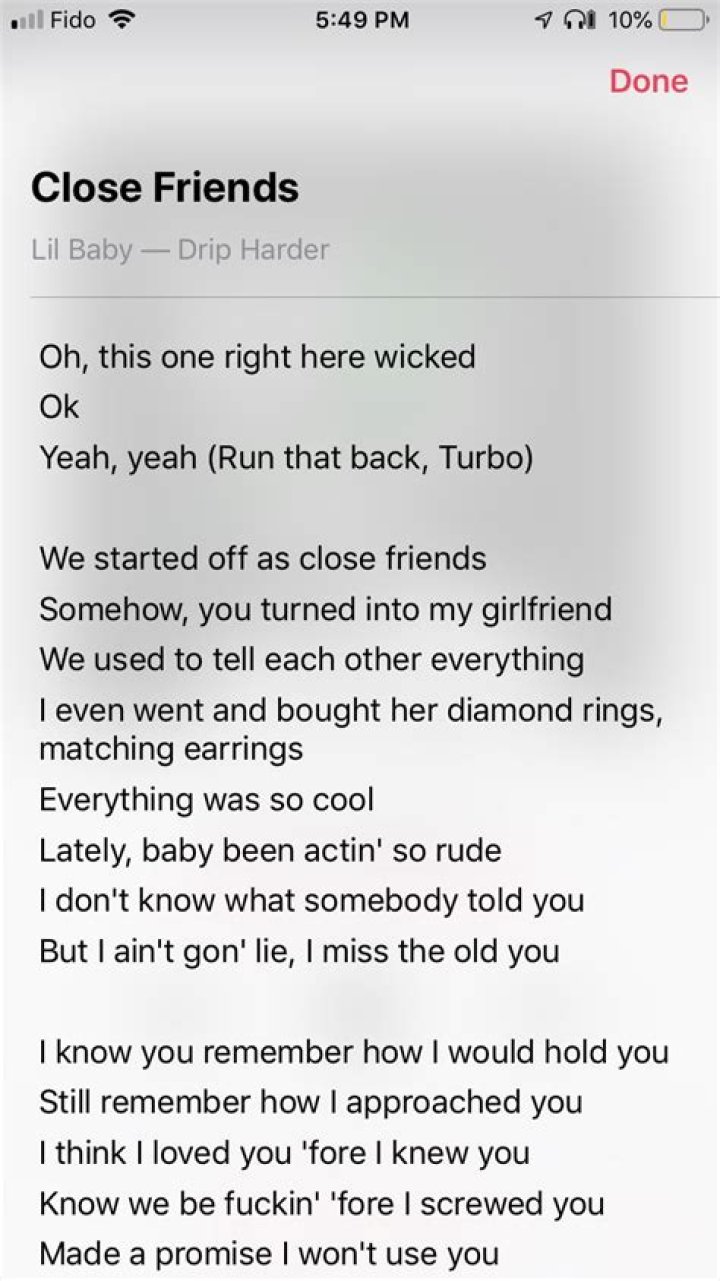 We started off as close friends (Close friends) Somehow you turned into my girlfriend (My girlfriend) We used to tell each other everything (Everything) I even went and bought her diamond rings, matching earrings Everything was so cool (So cool) Lately baby been actin' so rude (Been so rude) I don't know what somebody told you (What they told you)Lil Baby - Close Friends Lyrics