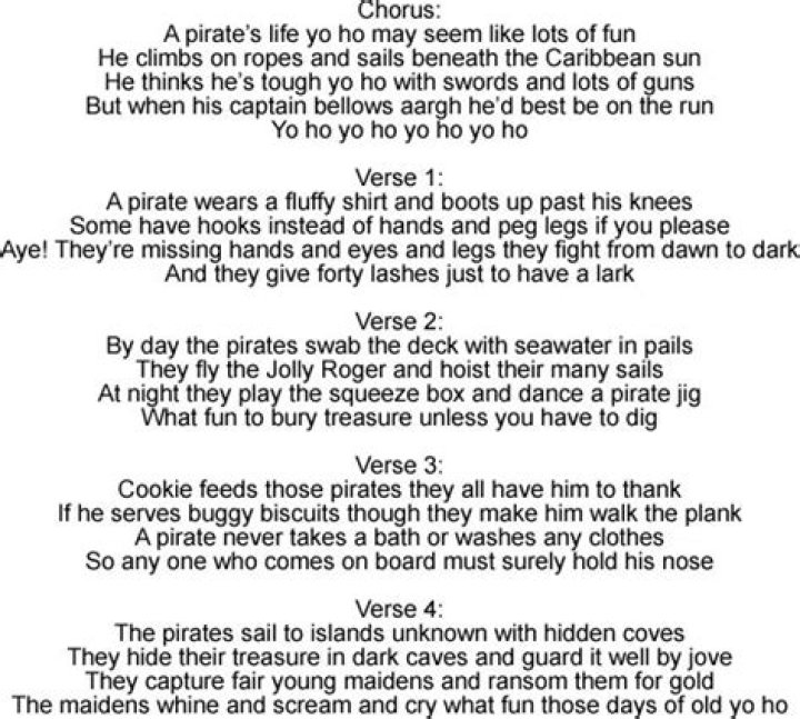 Yo ho ho and a bottle of rum. "Avast there mates, ye're sailin'. With Long John Black Beard. Peg-Leg, Patch-Eye Hook. Scourge of the bounding main. Bloodthirstiest, black-heartiest". "Pirate captain ever sailed the seven seas ha, ha, ha. What say ye, we hoist the Jolly Roger. Heel over the yonder Spanish galleon.RAY STEVENS - THE PIRATE SONG LYRICS