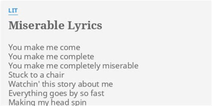 You make me come (Yeah, yeah) You make me complete (Yeah, yeah) You make me completely miserable I love the things that we should fear And I'm not afraid of bein' here So much the same It makes me helpless alone You make me come You make me complete You make me completely miserable (Yeah, yeah) You make me come (Yeah, yeah) You make me complete ...Miserable lyrics by Lit, 1 meaning, official 2022 song lyrics ...