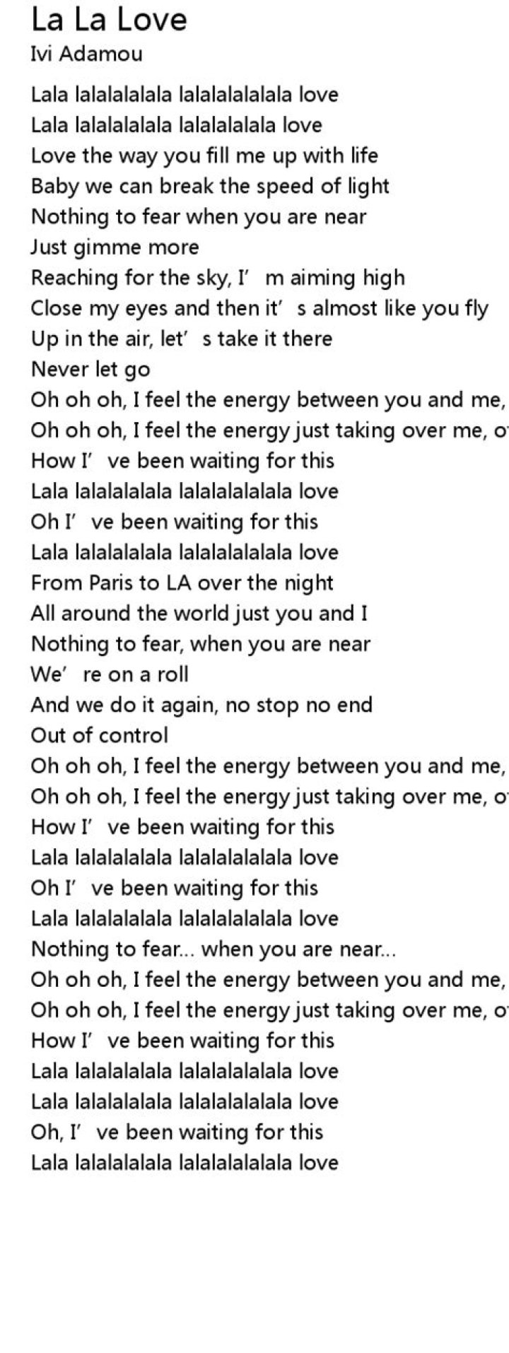 Lyrics to 'La La La' by Lmfao. ... this love starts now And how do I know you're real? ... She makes me wanna sing. La, la la la. You my new obsessionNe-Yo - Another Love Song Lyrics