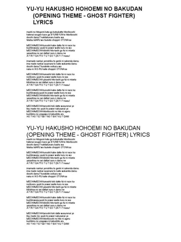Get lyrics of Yuyu hakusho theme song song you love. List contains Yuyu hakusho theme song song lyrics of older one songs and hot new releases. Get known every word of your favorite song or start your own karaoke party tonight :-).